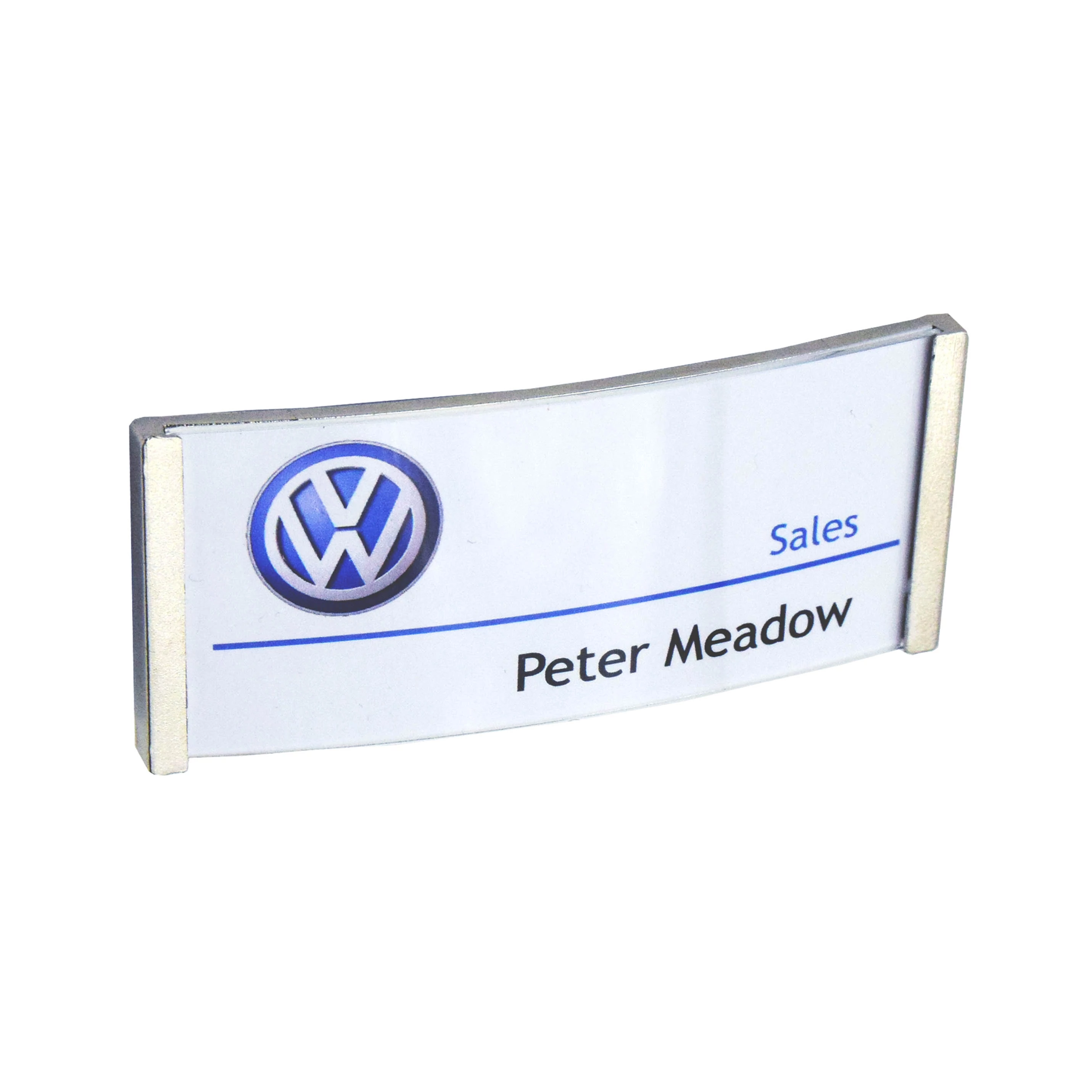 Enyhén domborított kialakítású, szinte a teljes felületén feliratozható névkitűző. Oldalán ezüst határolókerettel.