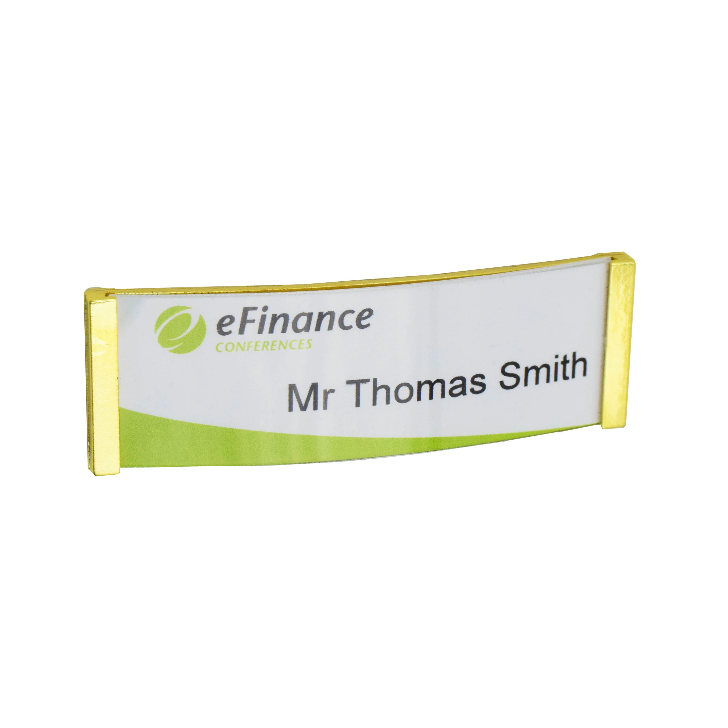 Enyhén domborított kialakítású, szinte a teljes felületén feliratozható névkitűző. Oldalán arany határolókerettel.