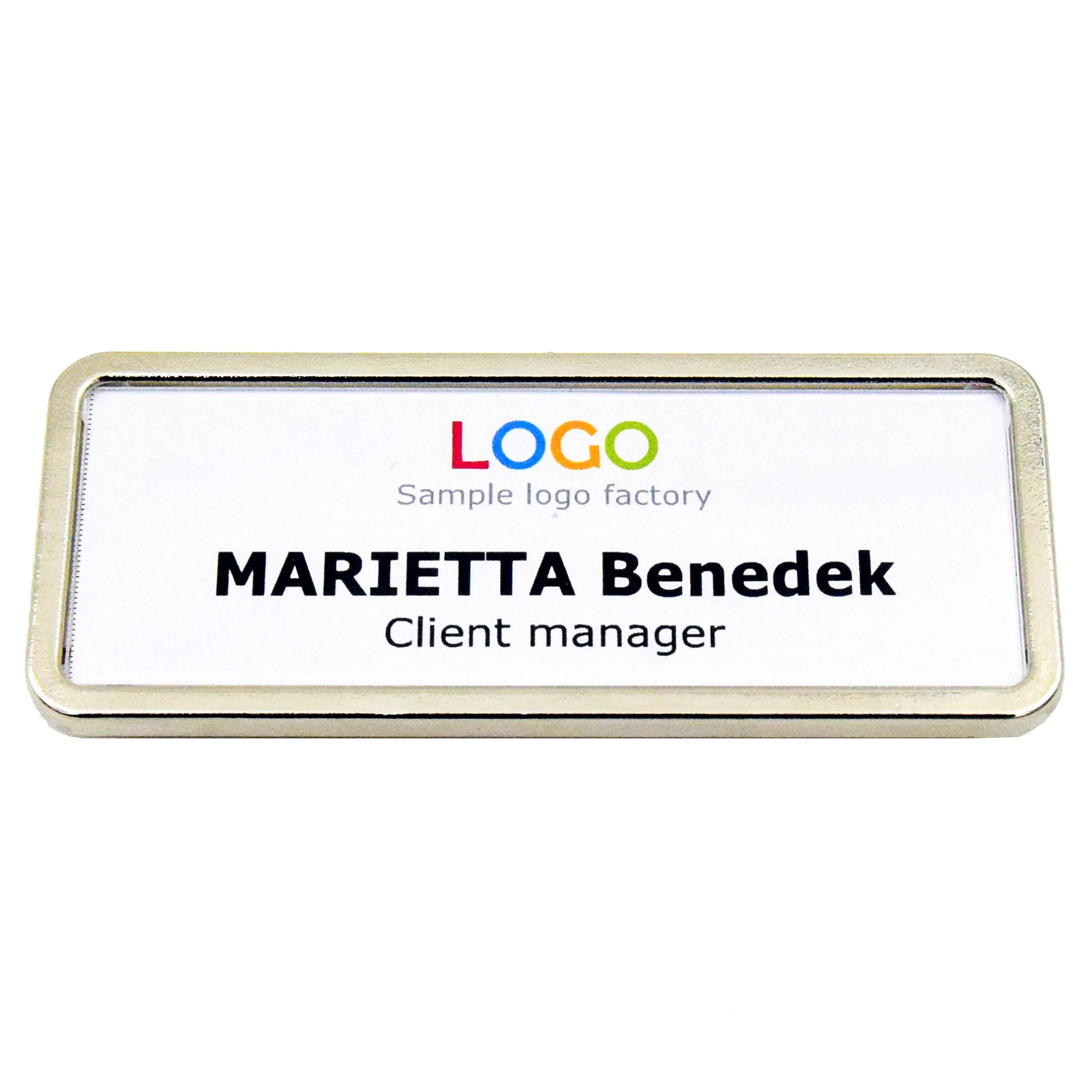 Egyszerű kialakítású, a teljes felületén feliratozható névkitűző. Szélein ezüst határolókerettel.