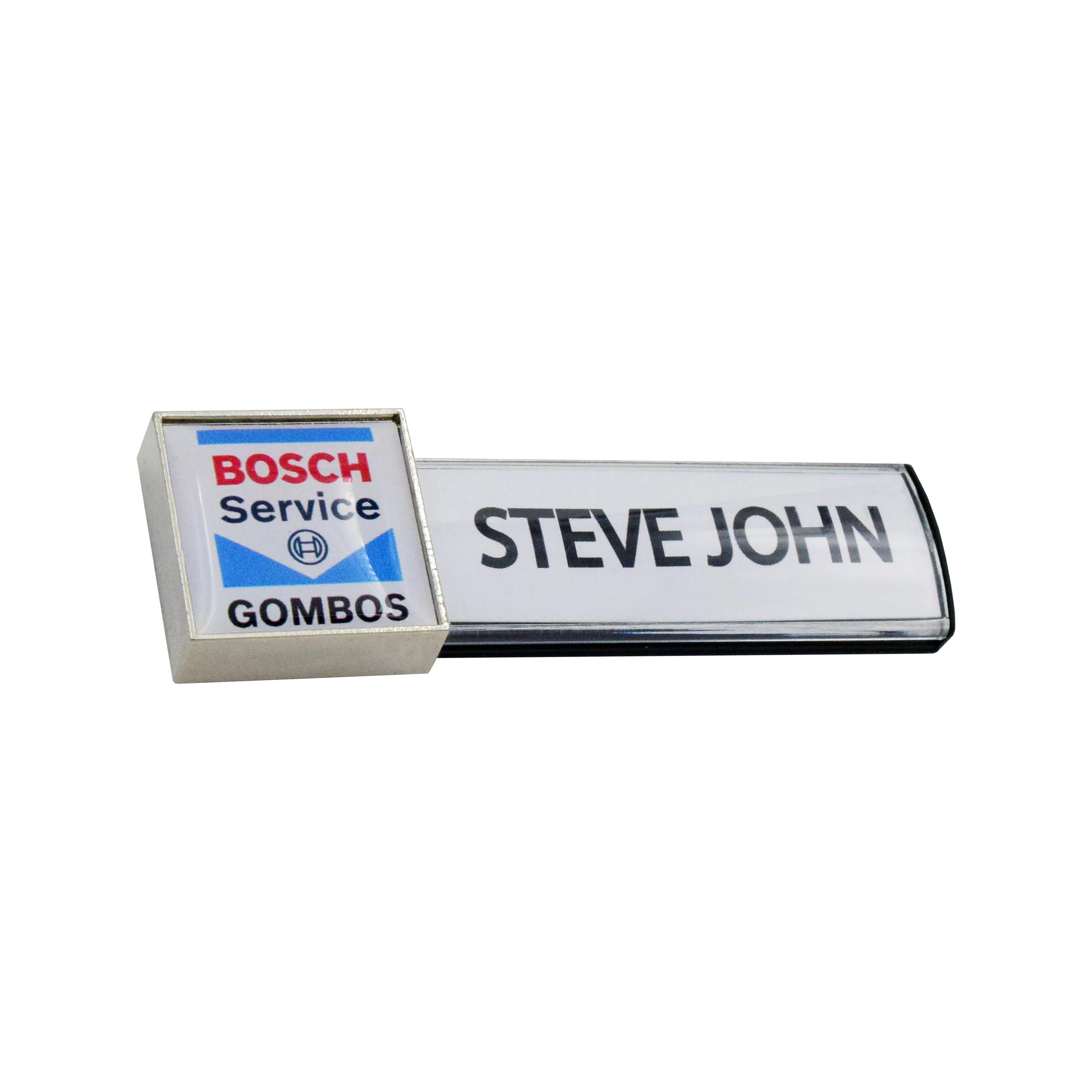 A két részből álló névtábla a figyelemfelhívó 3D-s logó révén egyszerre tükrözi igényesen a vállalat arculatát, és biztosít praktikusan kialakított, jól látható és könnyen cserélhető helyet a viselő nevének.