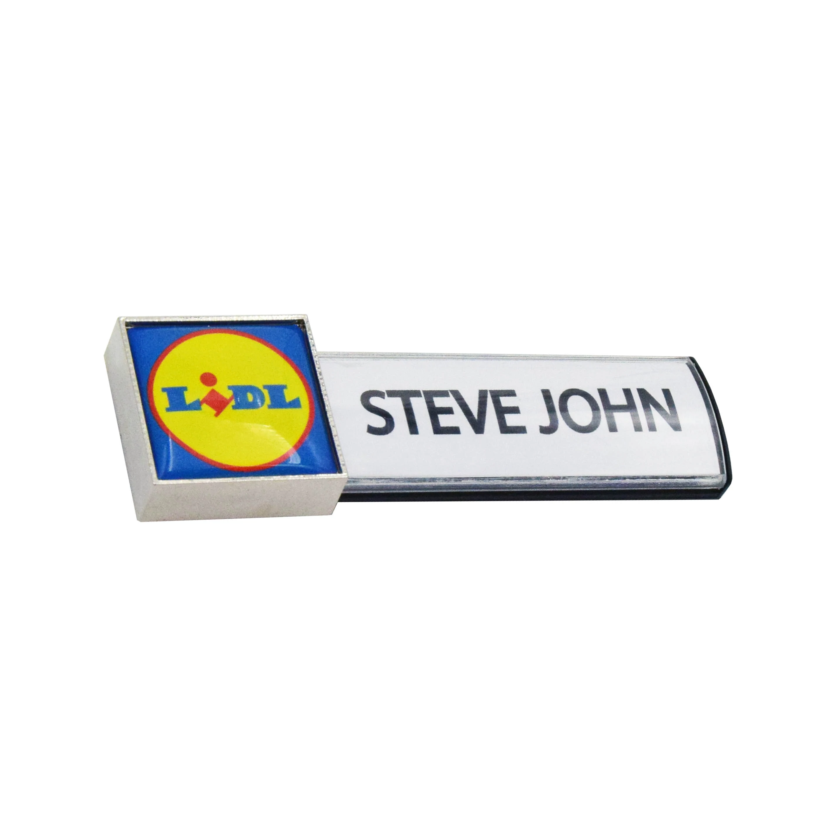 A két részből álló névtábla a figyelemfelhívó 3D-s logó révén egyszerre tükrözi igényesen a vállalat arculatát, és biztosít praktikusan kialakított, jól látható és könnyen cserélhető helyet a viselő nevének.