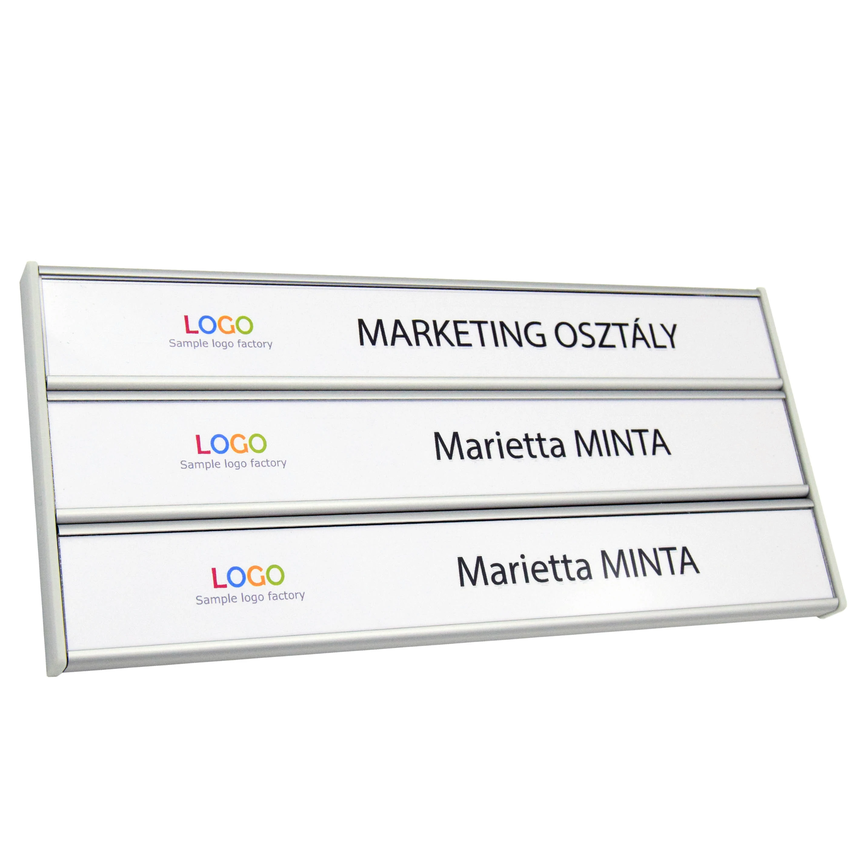 A megjelenítendő felirat akár asztali nyomtatóval is elkészíthető egyszerű nyomtatópapírra, amelyet egy átlátszó axpet lemez alá kell elhelyezni. Így egyedi, de mégis egységes arculat érhető el az irodai helységekben.